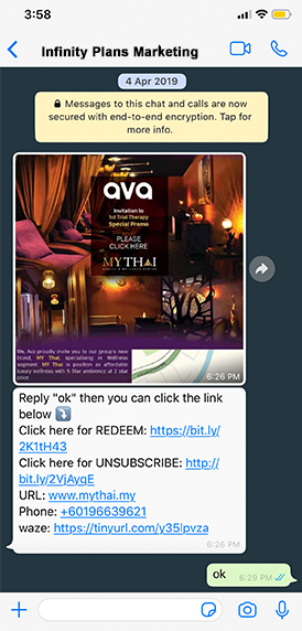 You are no longer limited to only texts when relaying messages. Using WA, you can do more than that without worrying about the cost. It can send text, image and videos which make your ads become more attractive.
